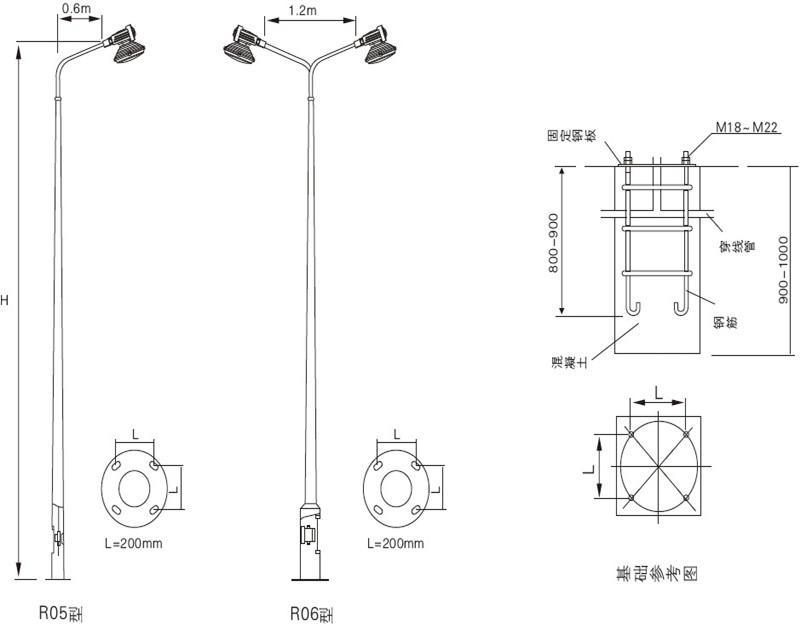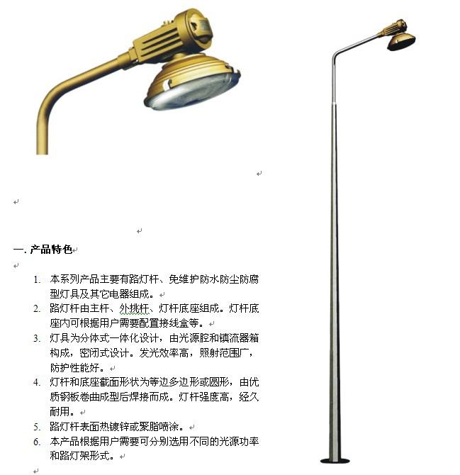 路桿燈型號(hào) 配套燈具型號(hào) 光源功率(W) 建議安裝高度 SBR6120-QL65R05 X-SBF6106-YQL65 65 5~6 SBR6120-QL65R06 X-SBF6106-YQL65 2X65 5~6 SBR6120-QL120R05 X-SBF6106-YQL120 120 6~10 SBR6120-QL120R06 X-SBF6106-YQL120 2X120 6~10 SBR6120-QL150R05 X-SBF6106-YQL150 150 8~12 SBR6120-QL150R06 X-SBF6106-YQL150 2X150 8~12