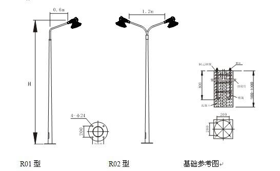 注:本路燈基礎(chǔ)圖適用于地基承載設(shè)計(jì)值f≥60kpa和最大風(fēng)力不超過(guò)11級(jí),在山區(qū)及f<60kpa的弱軟地基的地區(qū),地質(zhì)情況比較復(fù)雜時(shí),應(yīng)由當(dāng)?shù)乜辈煸O(shè)計(jì)單位確定。本圖僅作參考。